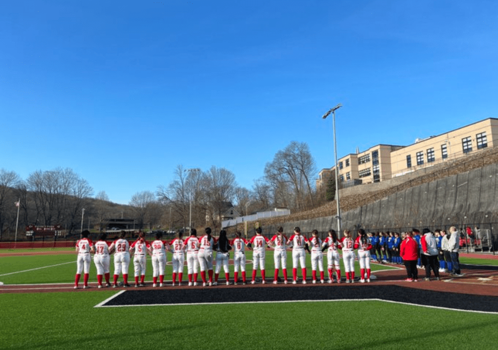 Photo courtesy of DHS softball Twitter: Softball team stands for The National Anthem.