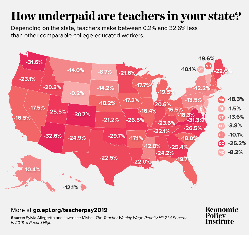 “Teachers are Underpaid: 15 Reasons They Deserve a Raise” adds, “They should not have to work side gigs just to make ends meet, but that is a big part of the profession today. Teachers are more likely to work a second job than most others in the workforce, but paying them a better wage would allow them to focus exclusively on their students. They give their time, patience, knowledge, and even their own money to help support their students. It is a job that many would not consider because of how much it stretches you in multiple ways. Unlike other professions, working harder does not lead to a higher salary.”