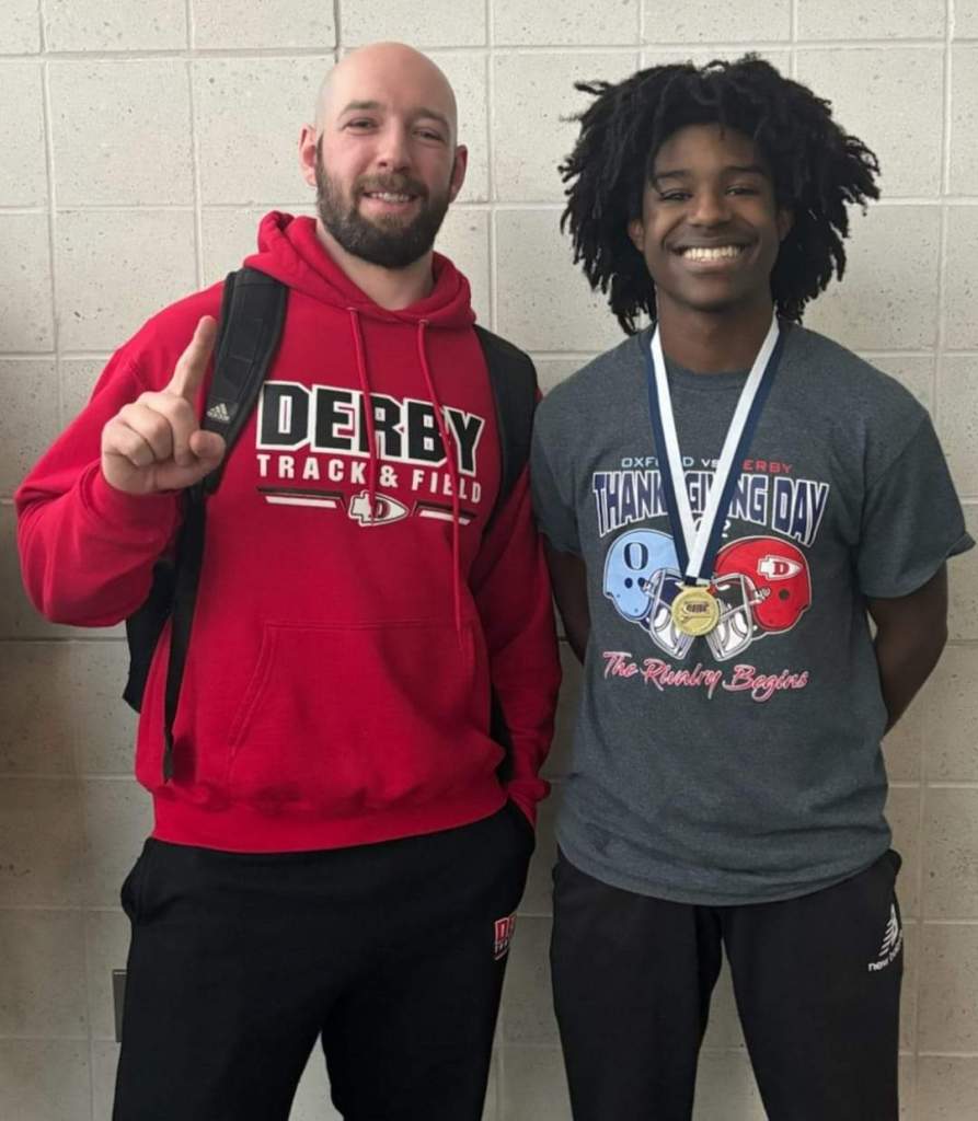 Photo from Derby High School Athletics CT (Facebook page): Nicolari with indoor track athlete Byron McLean ’24.