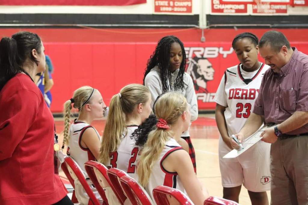 Photo from Derby High School Girls Basketball (Facebook page): Chevarella talking to the girls’ basketball team (23/24 season) during a timeout.