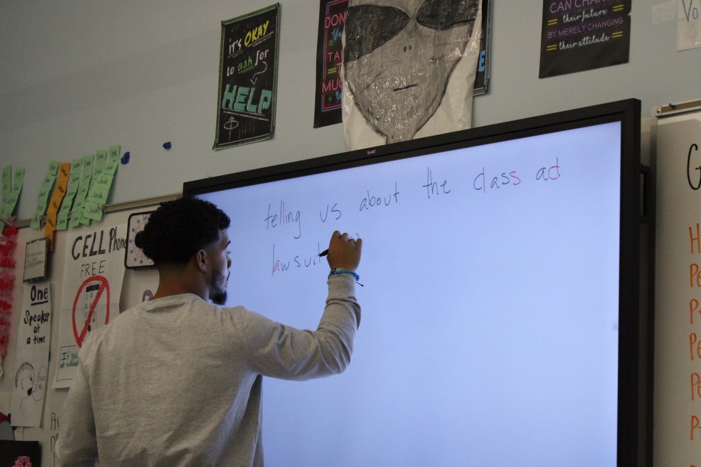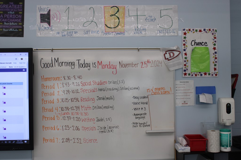 Ellis works in the Behavioral Learning Center (BLC) at DMS. His days start at 7:30 am as he gets ready and prepares class for the day. The BLC is small and has around ten students, which makes it easier for Ellis to help each student individually. The BLC runs on a daily schedule. When I first arrived, it was toward the end of their social studies period and Ellis was working with a student, helping him with his social studies work. The student was having a hard time staying on track and doing the work; Ellis pulled up a chair next to him, explained his work, and helped him cooperate to finish the last part of his assignment.