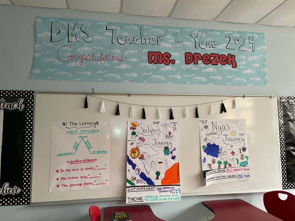 “I strive everyday to give my students 110% no matter what is going on in my life in and outside of school. I believe if I can show up for them 110% every day, I can help at least one kid in one way, whether it be academically, emotionally, socially, etc.” says Drezek on what she strives to give her students. I took a trip over to the middle school and got to interview many kids about their favorite things about Drezek as well as how she has impacted them. As one of Drezek’s former students, it was nice to see how much things have changed and what the students had to say about her as a whole. When DMS eighth grader Bianca Pizarro was asked what she liked about Drezek and how Drezek impacted her, this is what she had to say, “She knows how to kind of keep a smile on our face while keeping us entertained in our work…never a dull moment in her class, she’s impacted my year by actually teaching me something meaningful, she taught me to work through challenges and she was always there when help was needed.” I asked this question continuously and I received all good results from the nine students at DHS and DMS I interviewed. DMS eighth-grade student Emma Smith said this about Drezek, “Drezek always knows when and how to help people through things or when they’re sad or upset about something she always knows because they’ll have a look on their face.”