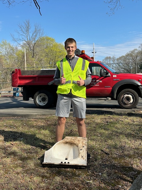 While walking down Nutmeg, the group split off into two and went to the picnic grove and the basketball courts, where an assortment of bottle caps, chip bags, and wrappers of sorts were obtained. At this point Derby Public works had a truck with us and were assisting in putting the growing amount of trash bags in the back. Emma Hyder ‘25 reported “I wasn’t surprised at the amount of trash picked up because in past years it has been more.” After Nutmeg was cleared out, the group headed to the football field and returned to the school afterwards.