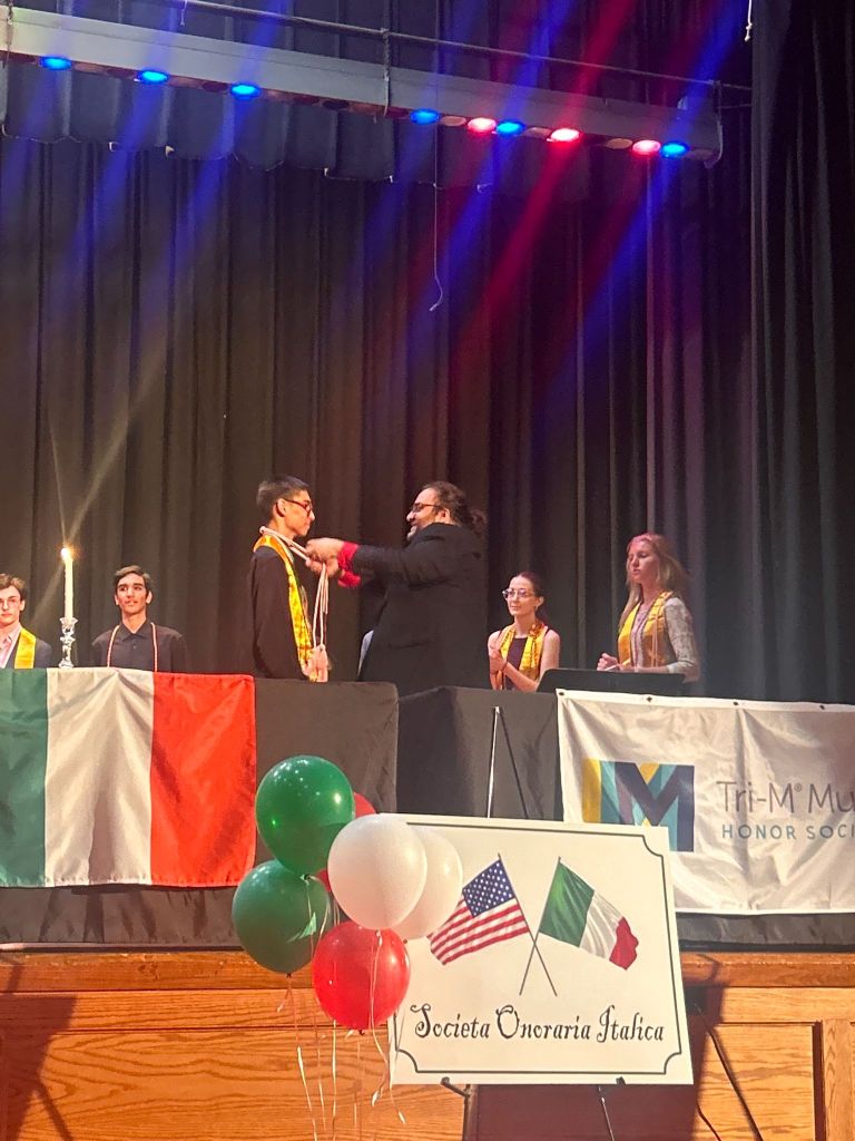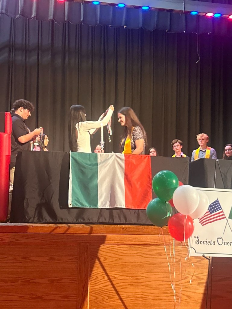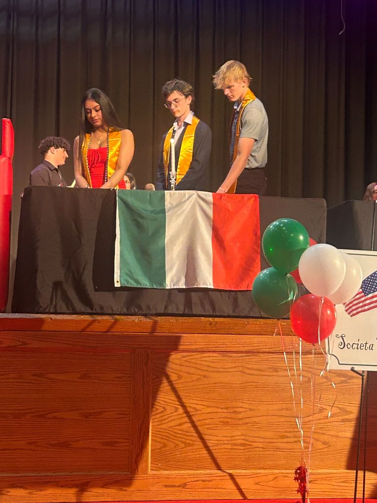 After all new inductees were inducted and graduating seniors received their red and gold cords for graduation, Italian teacher Hunter Sigona was called up to the stage to introduce the Italian Honor Society.
