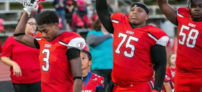 Photo by Anthony Mullin: Quincy Carter ‘26 and Horatio Glover ‘26 raising helmets during the National Anthem. By Fantasy Aponte '28 The Derby Red Raiders took their first win of their football season against Watertown at home on Sept. 19, 2025, with a 35-6 win. The Derby cheerleaders encouraged them excitedly on the sideline during … Continue reading Derby football thrives in game against Watertown