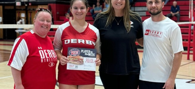 Photo from Derby Athletics X: Jersey Mike's reward recipient, Brianna Kling '25, poses with her coaches, along with Athletic Director Jenn Moffat. By Emma DeSanty '25 Derby High School athletics and Jersey Mike's Subs have teamed up to recognize fall student athletes and give them Jersey Mike’s rewards. Every Friday, a fall student athlete is … Continue reading Jersey Mike’s recognizes DHS student athletes