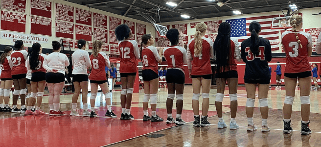 Photo by Linda Gray: Volleyball team stands for pre-game. By Quinlan Gray '25 This year, Derby High School girls volleyball is currently competing in their second season of being classified as a varsity sport. All of the girls have been working hard and improving their skills since July in hopes to make the state tournament … Continue reading DHS girls volleyball serves stronger second season