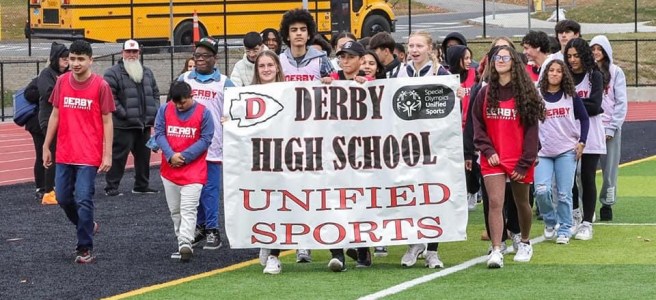 Photo by Anthony Mullen: The Derby High School Unified Sports team walks out on the field in unison during the opening ceremony. By Emma Hyder '25 On Monday, Nov. 4, 2024, the Derby High School Unified Sports team hosted Oxford High School’s Unified Sports team and Watertown High School’s Unified Sports team in the Annual … Continue reading Derby High School Unified Sports hosts annual Special Olympics CT Flag Football Tournament